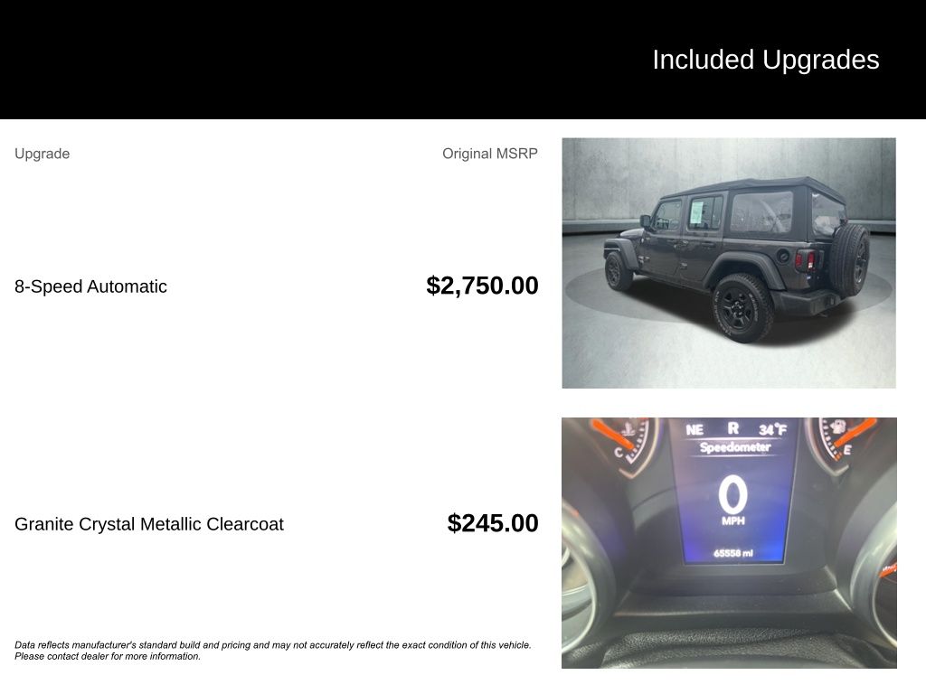 Powered by a 2.0L I4 DOHC engine and 4-wheel drive, this Wrangler Unlimited Sport delivers exceptional performance and off-road capability. With an EPA-estimated 21 city/22 highway MPG, it offers a balance of power and efficiency to tackle any adventure.