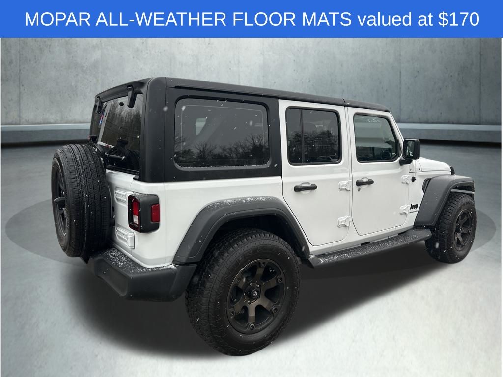 Stepping inside, you'll be greeted by a spacious and well-appointed interior, featuring comfortable cloth low-back bucket seats and a host of advanced technologies to keep you connected and entertained. The Wrangler's signature style is enhanced by the sleek, white exterior, making it a head-turning presence wherever you go.