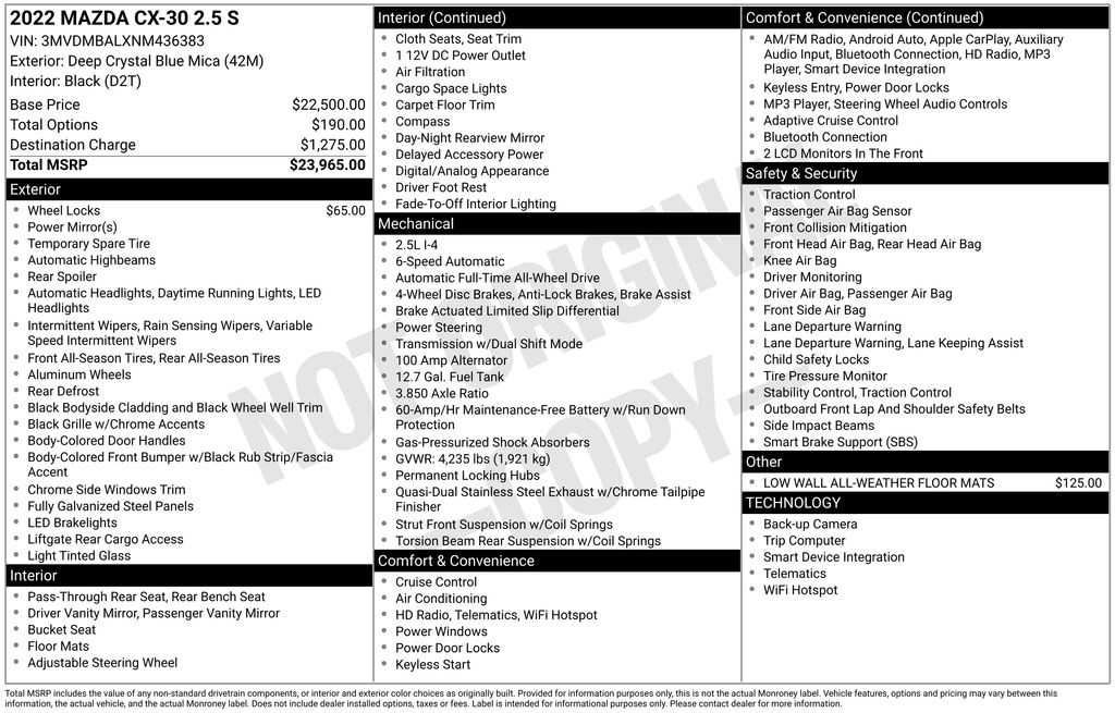 I had been shopping around for a new vehicle in the sub-$30,000 price range for months now and I had been quite disappointed with what I saw in that price range until I stumbled upon Mazda. I got into a CX-30 in the showroom at the Mazda dealership and I was pleasantly surprised, everything on the interior was covered in soft leather, there were knurled knobs and switches, and cool color combinations. A few weeks later I bought my own CX-30 and it has been a great vehicle so far, the CX-30 is great for a lot of reasons but there are also quite a few drawbacks to consider. On the uphand the car is put together well… everything feels solid, there are no rattles or squeaks, the drivetrain is super solid (2.5 I4 + 6 speed auto), the engine works well with the transmission and I feel good about the reliability of both components, the safety systems in the car work well, all the lights in and on the car are all LED on all trims which is nice, the car is an IIHS top safety pick+, the car looks much more expensive than what it is… people have confused my CX-30 for a Mercedes/BMW multiple times, the base 8 speaker audio system is really good for a base system, the seats are really comfortable for most all body types, and I like how simple the car is… it’s refreshing. There are some downsides and they are as follows, the engine is relatively loud and the noise from the engine isn’t a pleasant one, the 18in wheels don’t give the car the best ride quality or turning circle, the car doesn’t get the best MPG in the class (avg. is 26mpg), the cupholders are placed in a weird spot which makes accessing larger cups a challenge, the beltline of the car is high which means the windows are small and hinder visibility, the back seats are cramped… really cramped, there is a significant blind spot due to the small windows in the rear (I would highly advise getting a CX-30 with blind spot monitoring), the exhaust/driveshaft creates a large hump in between the seats in the second row which makes it even more cramped for someone sitting in the middle seat, and the parking brake engages automatically and can be tricky to disengage when you set off. Now you may have just read all of that and thought to yourself that all that doesn’t sound good, but trust me you’ll get over those things because the rest of the car is phenomenal and I couldn’t be happier with the car, I plan on keeping it until the wheels fall off it. Hope this review was helpful, as an owner's perspective on what they think about the car. - 5.0